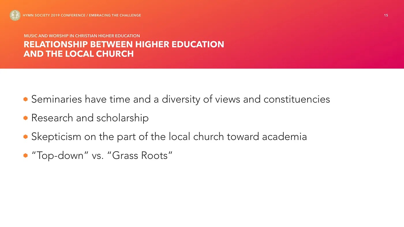 The difficulty lies in determining what this means on an institutional and curricular level. Do seminaries view the local church as a market for their graduates? Do seminaries have a prophetic role in guiding the conversations that churches have regarding music and worship? Do the churches view the seminaries as places that provide viable and practical skills that are necessary for ministry in the twenty-first century?